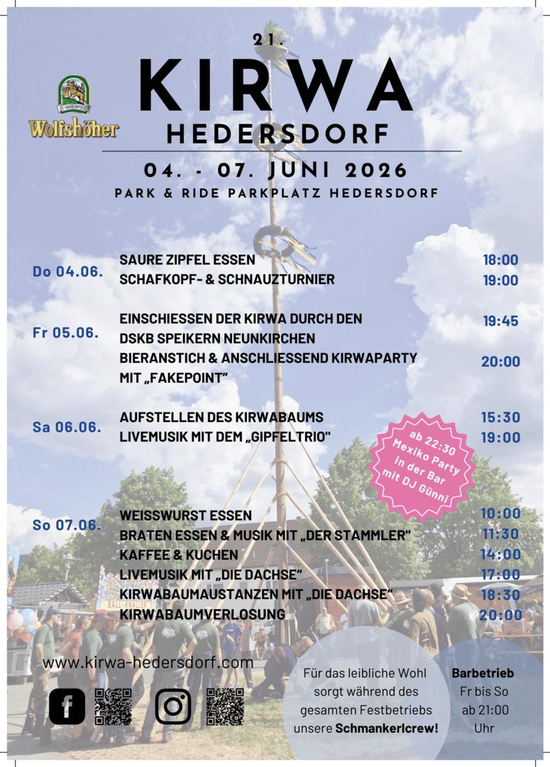 Die diesjährige Kirwa findet vom 4.-7. Juni 2026 statt. Das Rahmenprogramm könnt ihr dem angehängten Flyer entnehmen.